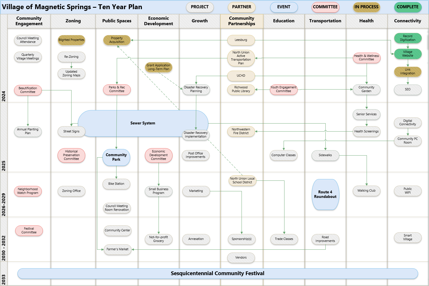 Council will begin forming several committees in 2024 to start work towards accomplishing these specific goals prior to 2033. YOU are strongly encouraged to step up and make a difference by helping your community shine! Each part of the plan depends on and/or completes other parts, so working together will be critical.